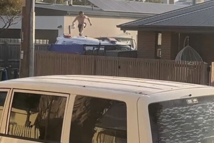 CCTV shows shirtless man run from scene after police car rammed