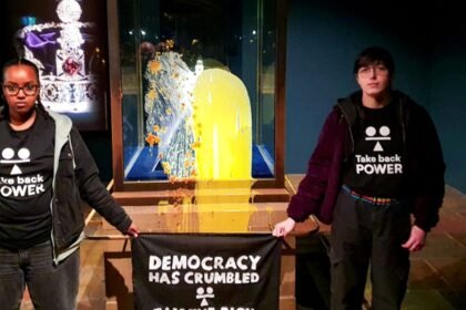 Protesters arrested after smearing crumble and custard on Crown Jewels case in Tower of London