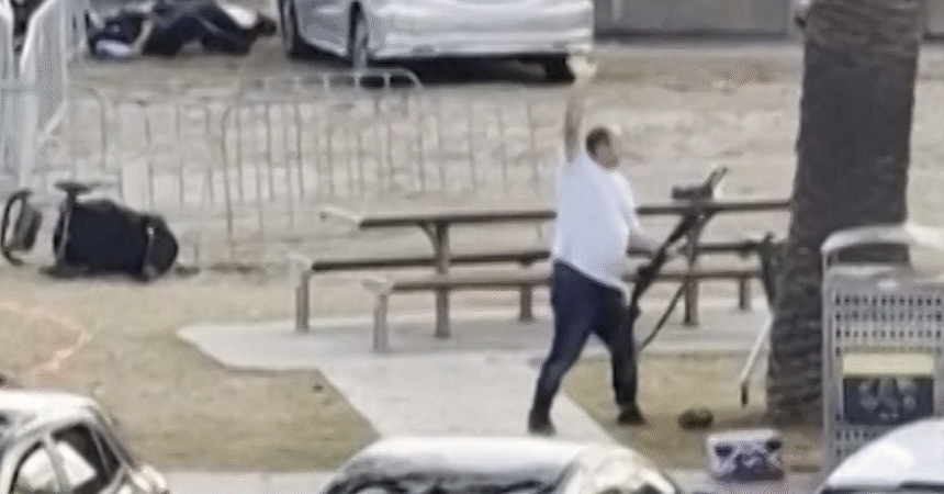The video was taken from an alternate angle, from across the car park, and shows Ahmed as he grabbed the firearm and pointed it at the shooter.