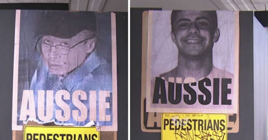 Posters showing the CCTV image of the man accused of scalding baby Luka with hot coffee in 2024 were placed on a construction site wall on Chapel Street in Prahan.