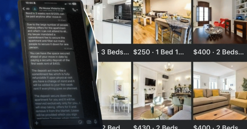 Fake “private landlords” on Facebook marketplace promising listings below market price for a costly deposit. (9News)