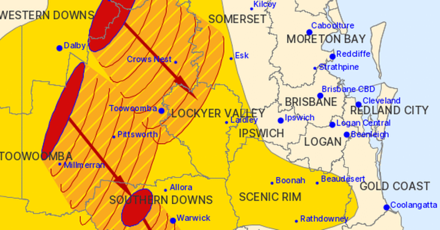 Forecasters said hail stones had already been reported near Dalby and Kingaroy, west of the Sunshine Coast, as storms headed south-east.