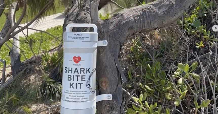 The inexpensive kits contain a tourniquet, two conforming bandages, two large dressings, an emergency thermal blanket, gloves, a whistle and step-by-step instructions on how to treat a shark bite.