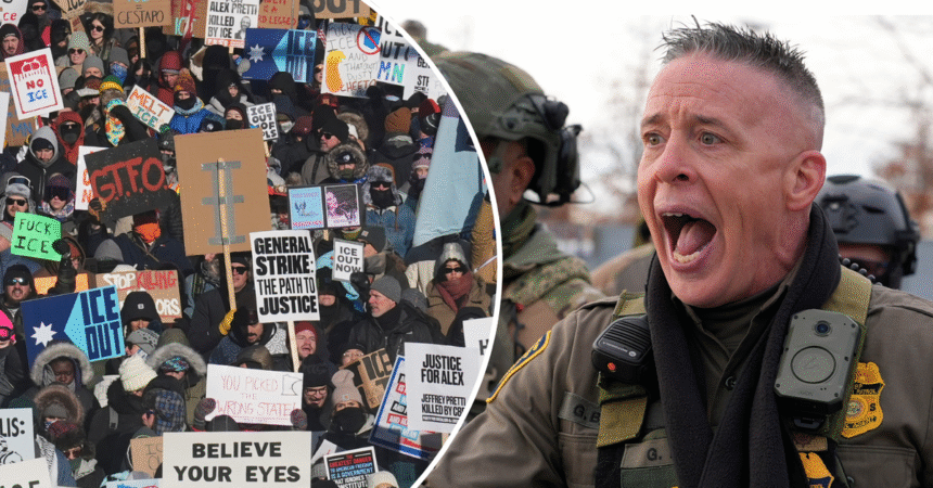 Greg Bovino shouts at members of the media in Minneapolis. (AP)
