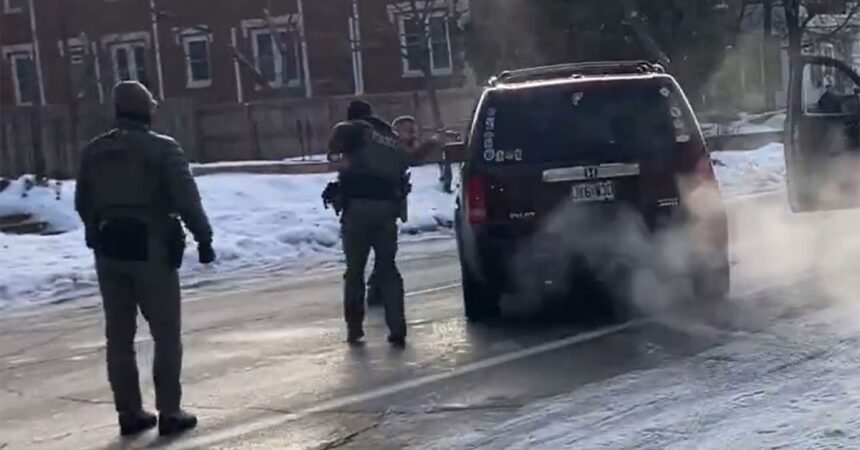 “Get out of the f—ing car,” one masked agent says as he walks to her vehicle, before grabbing the door handle.