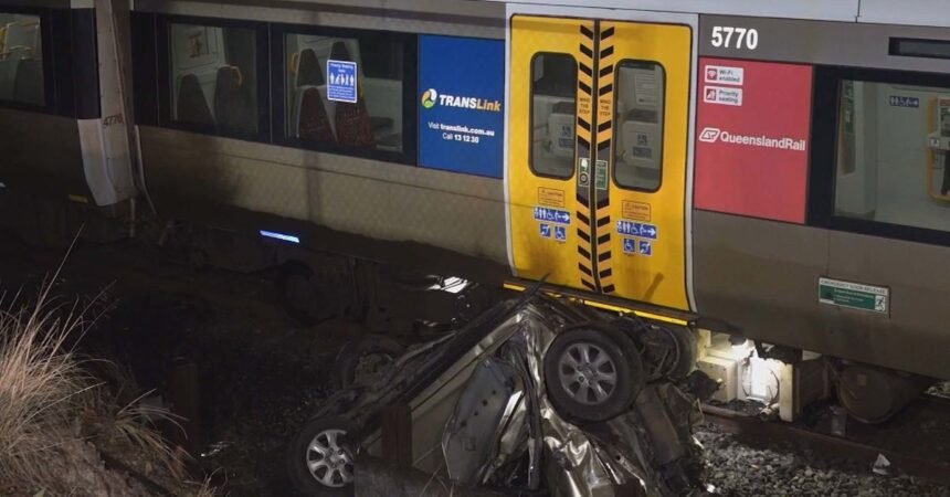 A woman in Queensland made a miraculous escape after becoming trapped when her car lost control and ended up on train tracks.